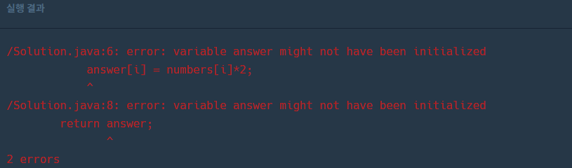 이 배열 선언 중 초기화를 하지 않아서 오류가 발생하였다.